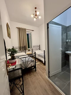 In diesem Zimmer befinden sich zwei Einzelbetten. Das Badezimmer mit Dusche und Toilette befindet sich im Zimmer.