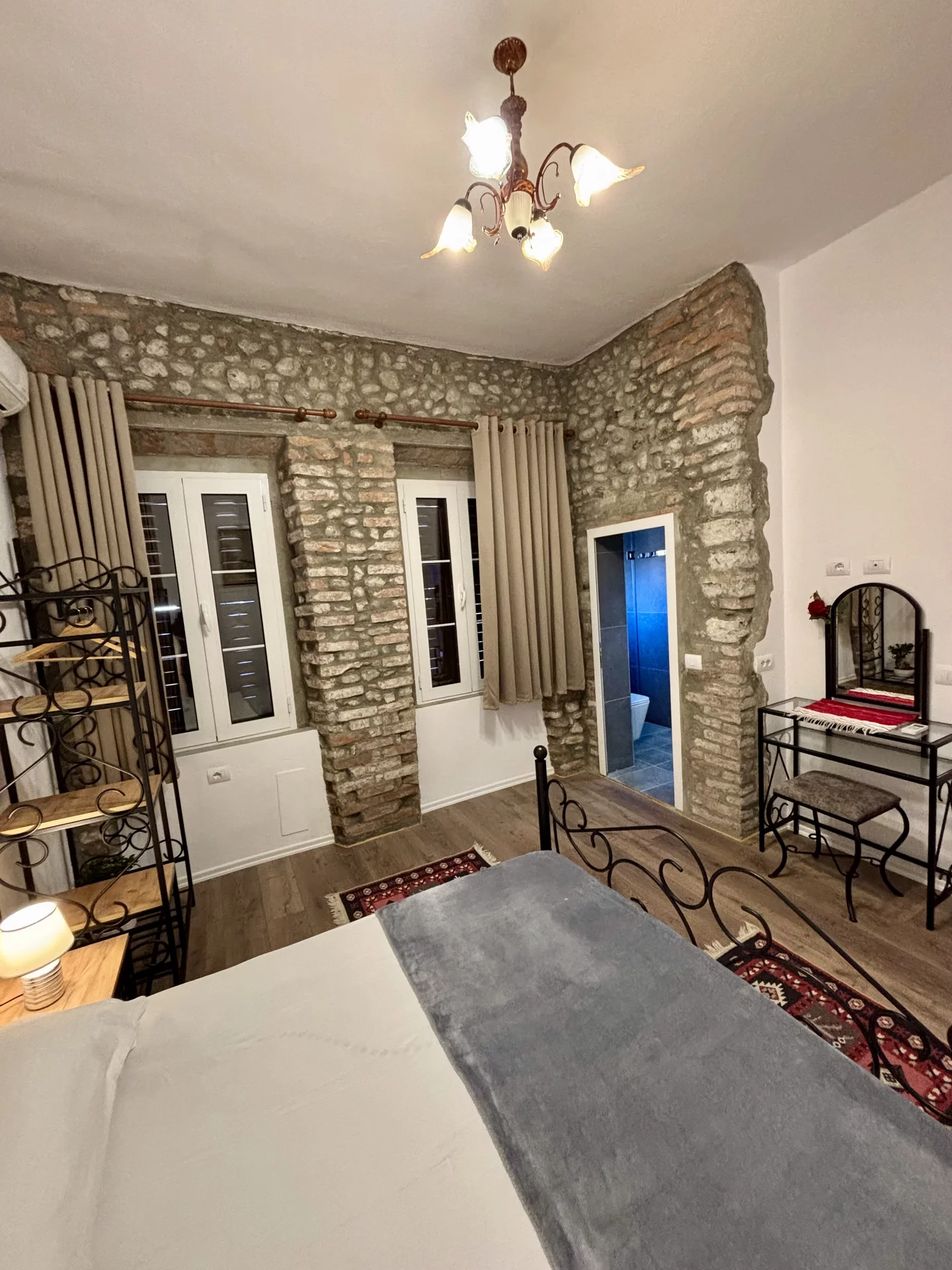 In diesem Zimmer befindet sich ein Doppelbett. Das Badezimmer mit Dusche und Toilette befindet sich im Zimmer.